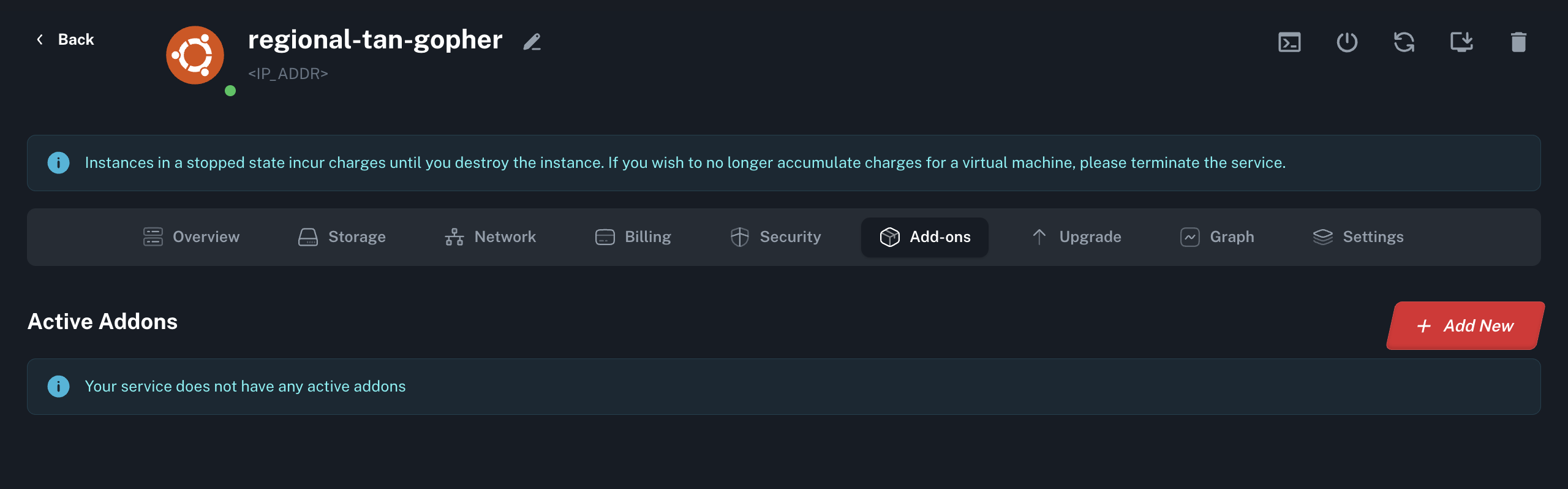 Go to the management page of any VM in the region where you need extra bandwidth, and click the Add-ons tab: