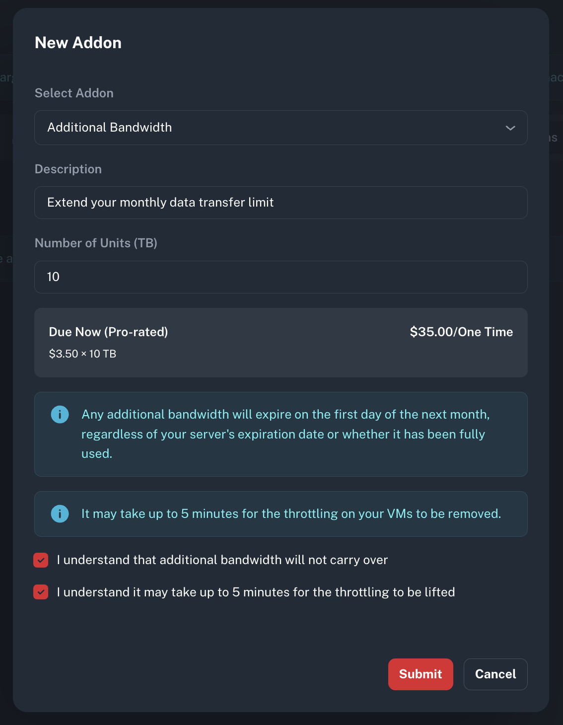 Choose your desired extra bandwidth and click Submit, a new invoice will be issued for payment. Pay the invoice to activate your bandwidth immediately.