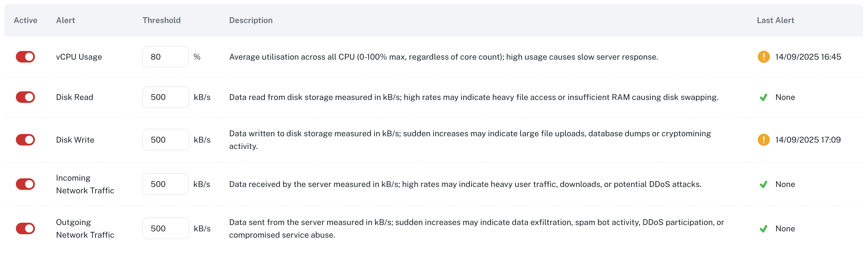 Resource alerts are automated notifications that monitor your server's performance metrics and notify you when usage patterns may impact server performance. This proactive monitoring helps you identify and resolve issues before they affect your users, including detecting potential security threats such as malware infections, suspicious activity, or unauthorised access attempts.
