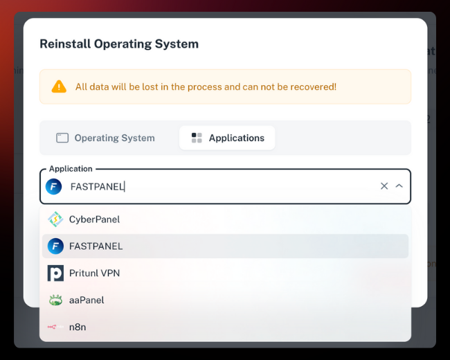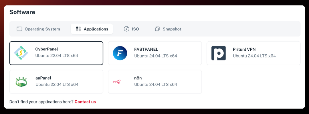 Wide selection: Choose from commonly used apps such as CyberPanel, FASTPANEL, n8n, aaPanel and more.