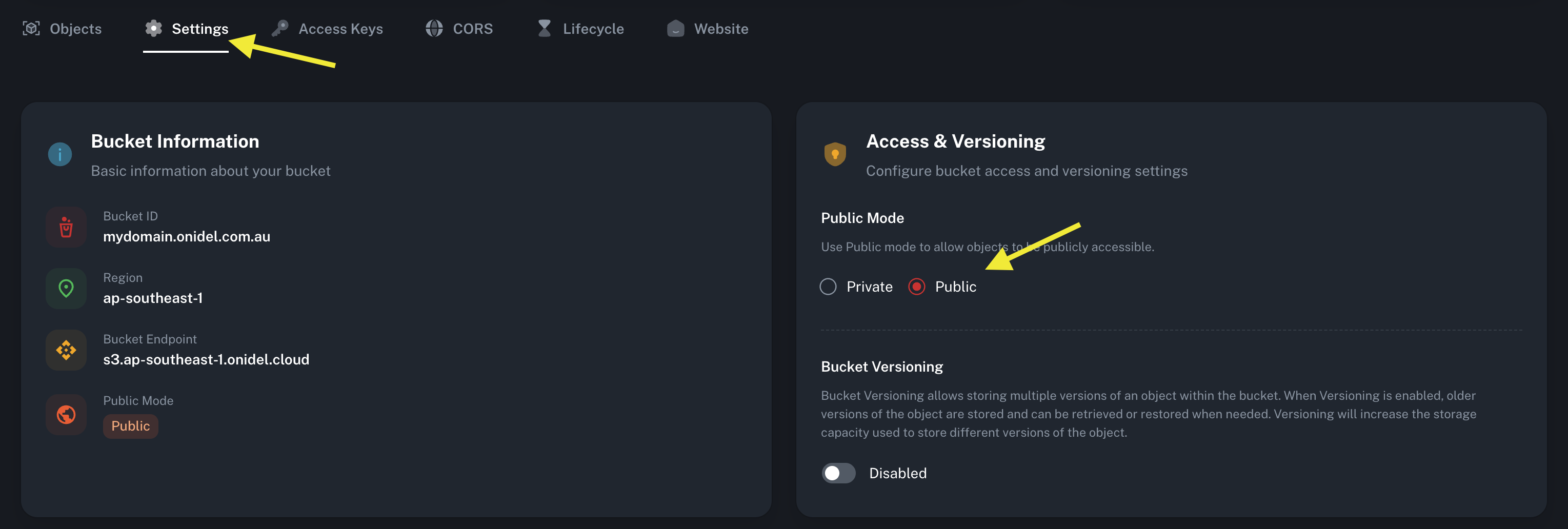 This guide walks you through configuring a custom domain to serve content from Onidel Object Storage, enabling you to host static websites or serve files using your own domain name instead of the default Onidel storage URLs.