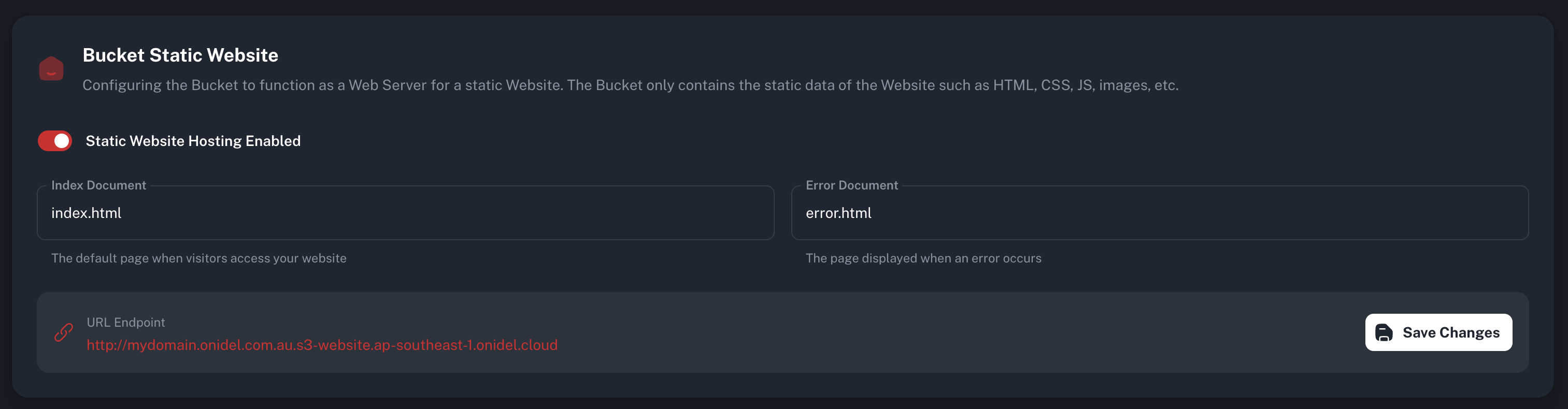 Once static website hosting is enabled, Onidel Object Storage generates a unique website endpoint for your bucket. This endpoint follows a specific format based on your bucket's region: