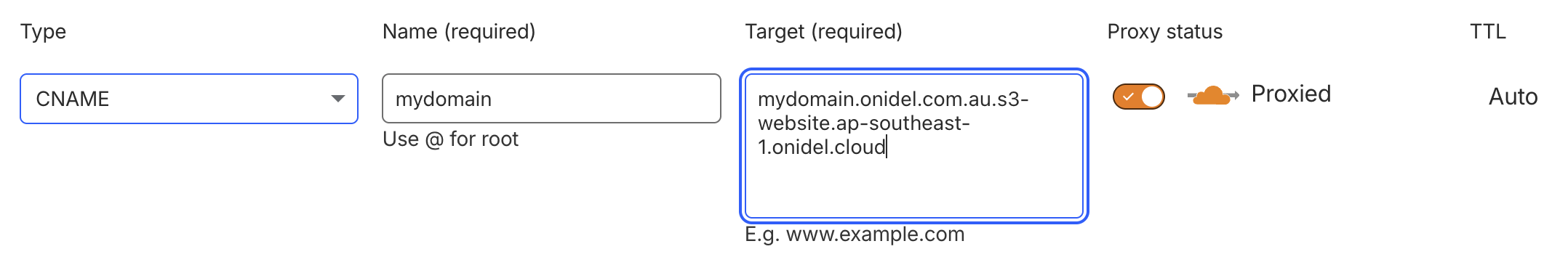 Onidel Object Storage supports static website hosting with custom domains through a straightforward configuration process. By creating a specially-named bucket and configuring DNS records, you can serve your content directly from your own domain with full SSL support through Cloudflare's proxy service.