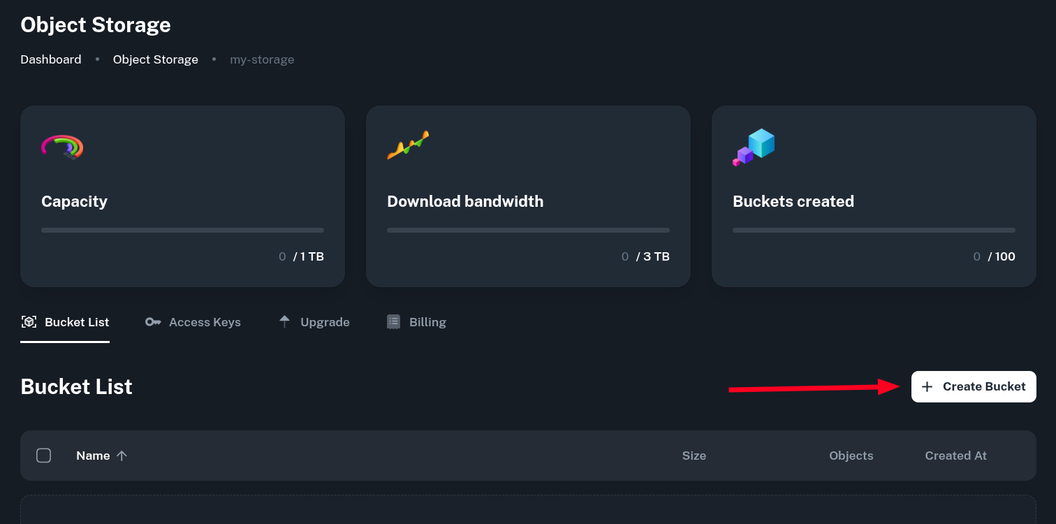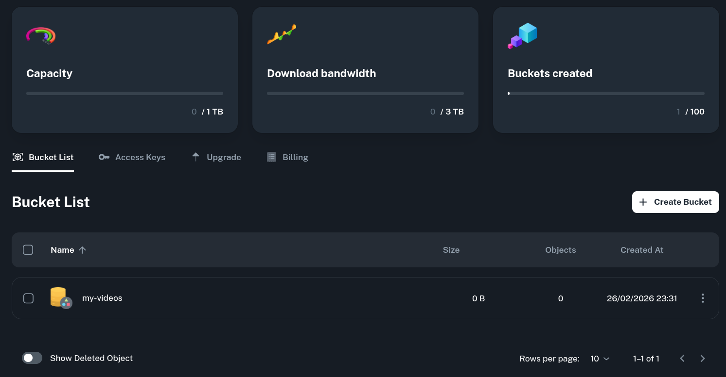 After going to your newly created service, you can see stats about usage of capacity, traffic and active bucket amount. You can also create a new bucket.