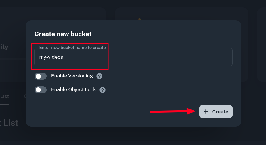 Object Lock toggle - if you want to enable WORM (Write Once Read Many) feature of object storage. This ensures no data can be deleted and that there are always past versions of objects stored. Enabling WORM also turns on Versioning option.