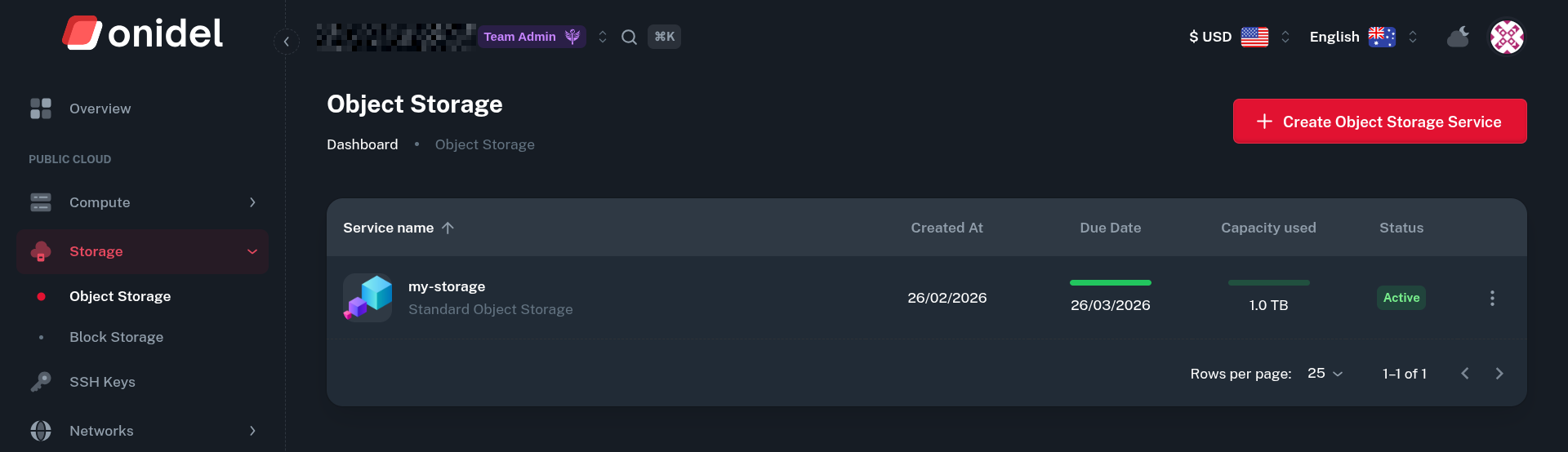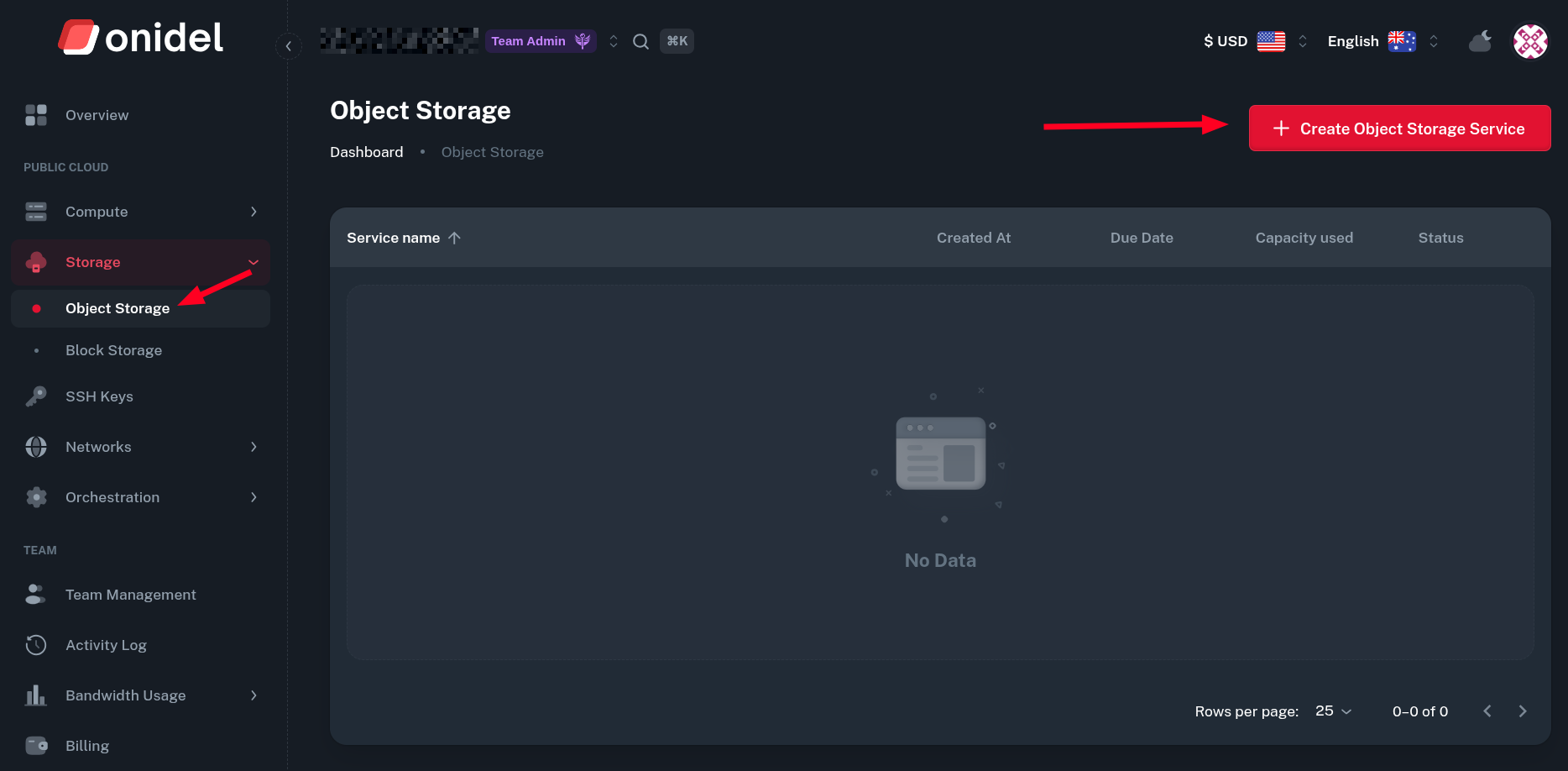 Log into Onidel Cloud Panel and navigate to Storage > Object Storage. Then, click on Create Object Storage Service button.