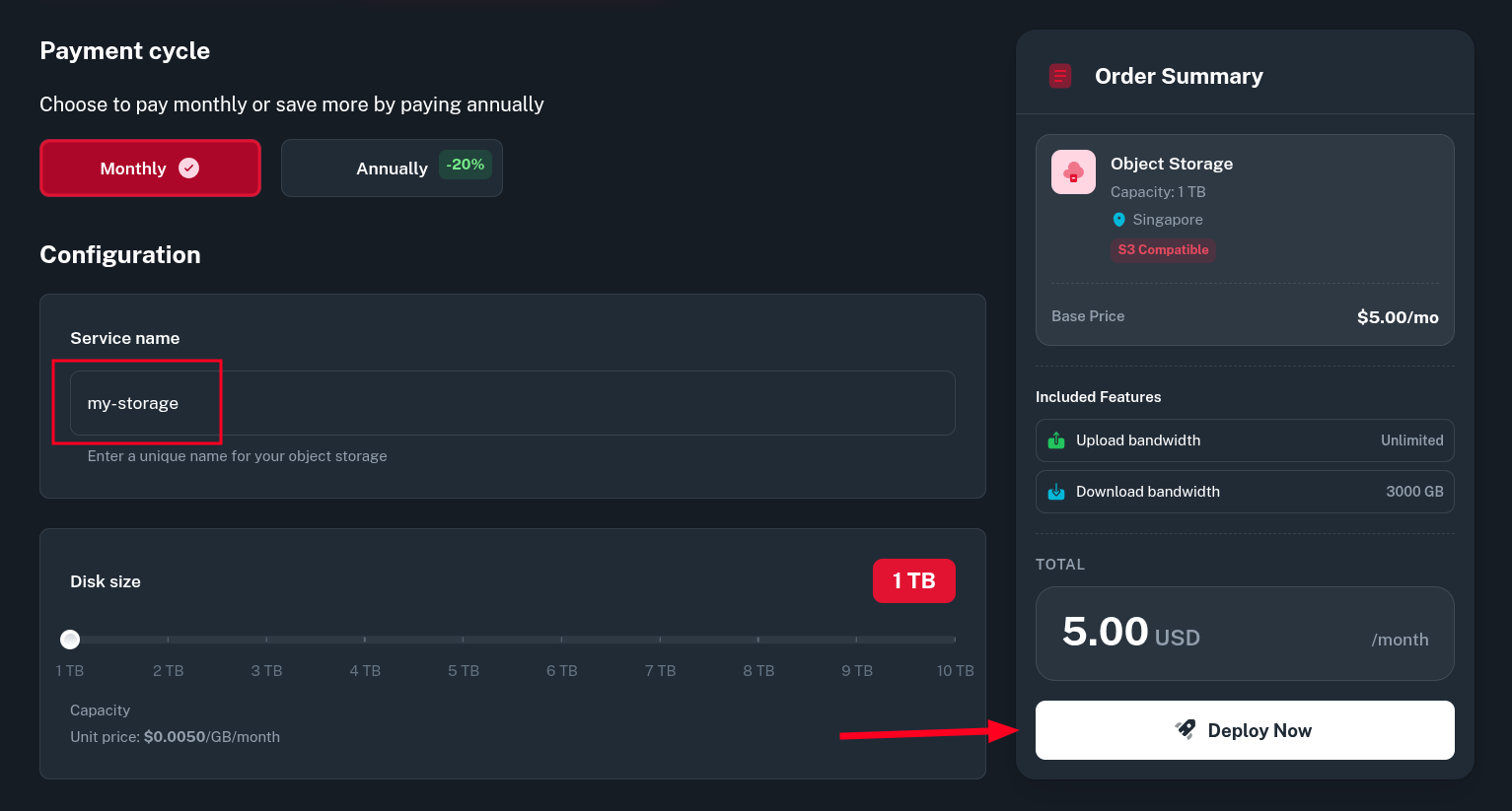 Storage Size - desired maximum object storage size, starts at 1TB and can be upgraded later. It can not be downgraded later.