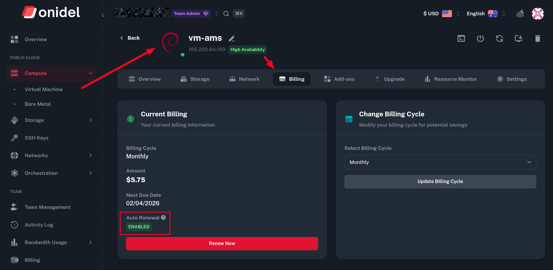 The Virtual Machine Instances created on Onidel Cloud Platform have Automatic Renewal turned on by default. This prevents the service from being suspended in case you don't manually pay the invoice before due date. Automatic Renewal only applies to invoice based billing periods (monthly and longer). There is a similar concept for Hourly Billing called Auto Recharge. The invoice amount will be deduced from credits available in the account or subscription based payment methods.