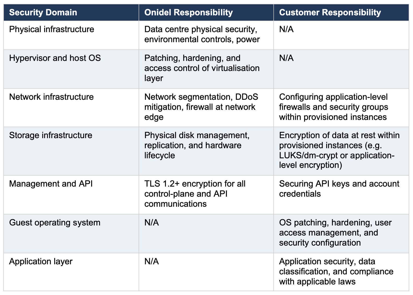 Onidel operates an infrastructure-as-a-service platform. Security is a shared responsibility between Onidel and the Customer. Onidel is responsible for securing the physical infrastructure, hypervisor, storage hardware, and network infrastructure. The Customer is responsible for securing the guest operating system, applications, and data within their provisioned instances.