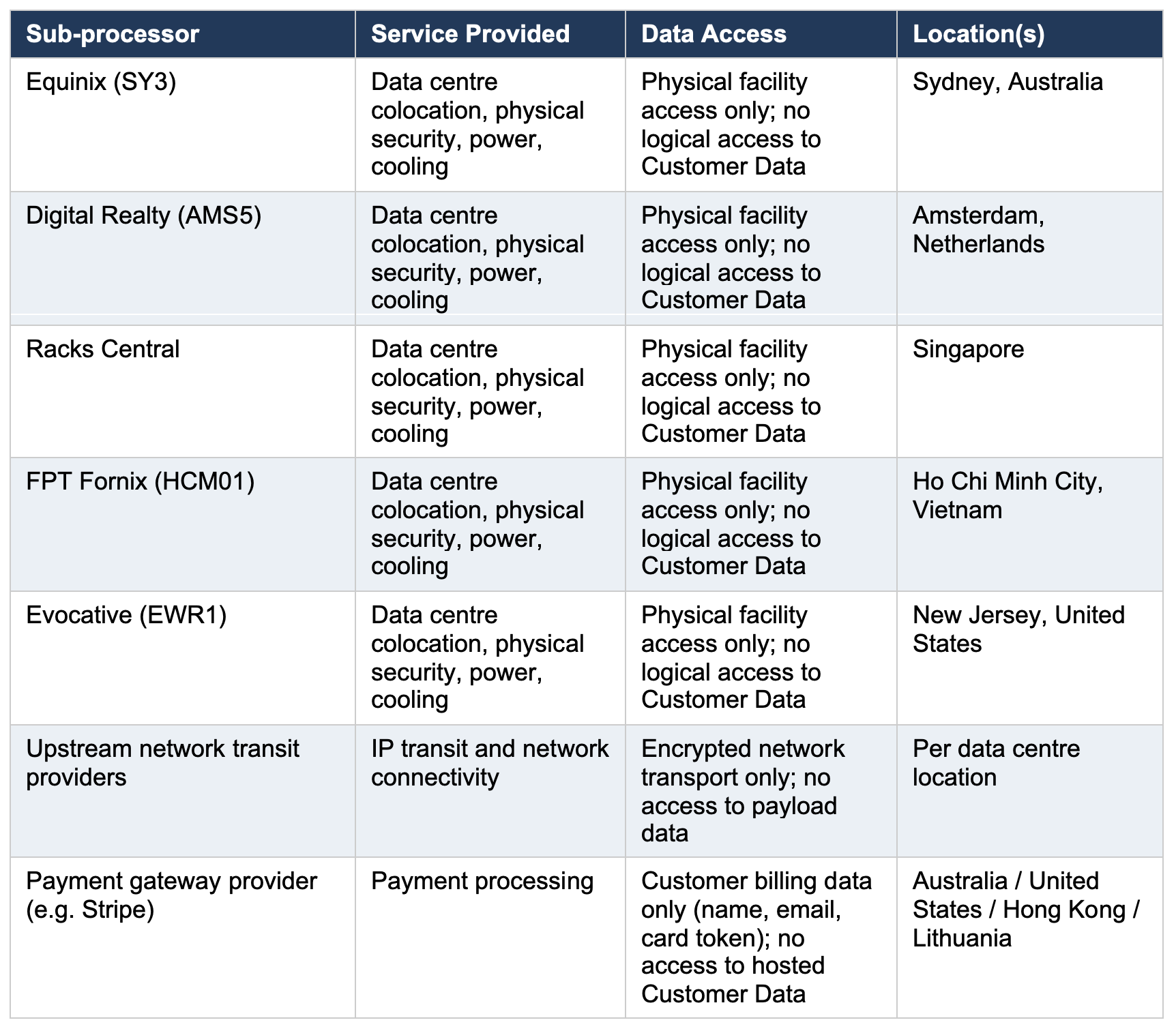 Onidel engages the following sub-processors in connection with the delivery of the Services. Only sub-processors relevant to the Customer’s selected data centre location(s) apply to the Customer’s deployment.