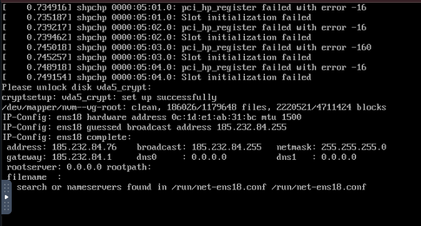 If the IP parameter was added correctly, you should be greeted with the following parameter listing displayed after the network is set up with initramfs.